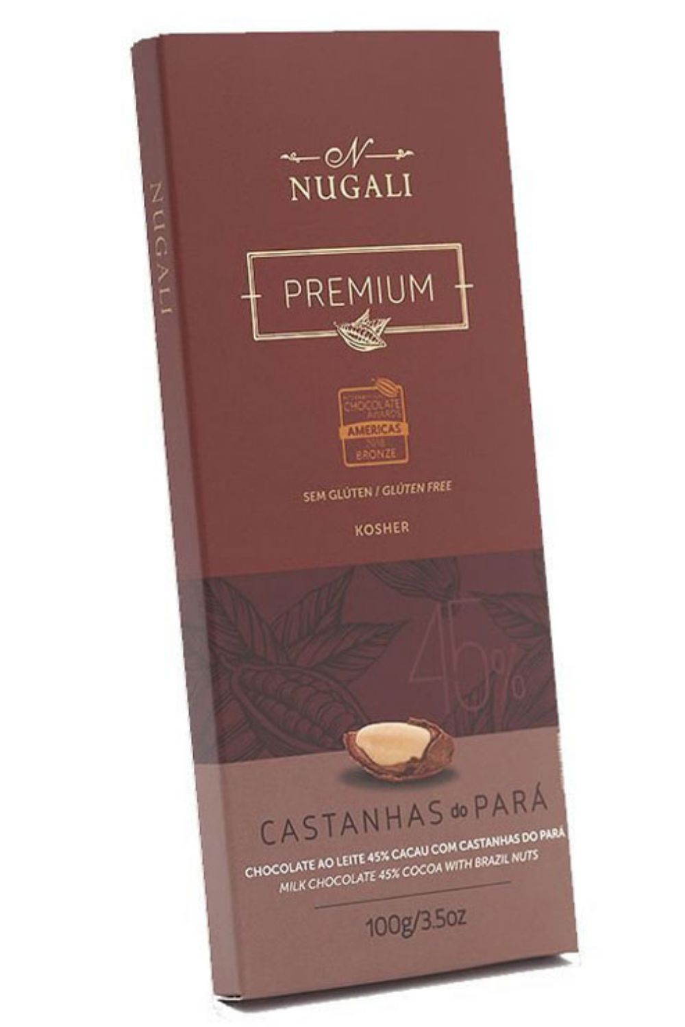 A Castanha-do-Pará, tipicamente brasileira, conhecida internacionalmente como Brazil Nut, em uma combinação perfeita com o chocolate ao leite Nugali (45% de cacau). Tablete premiado, medalha de Bronze na Internacional Chococolate Awards América em 2018.