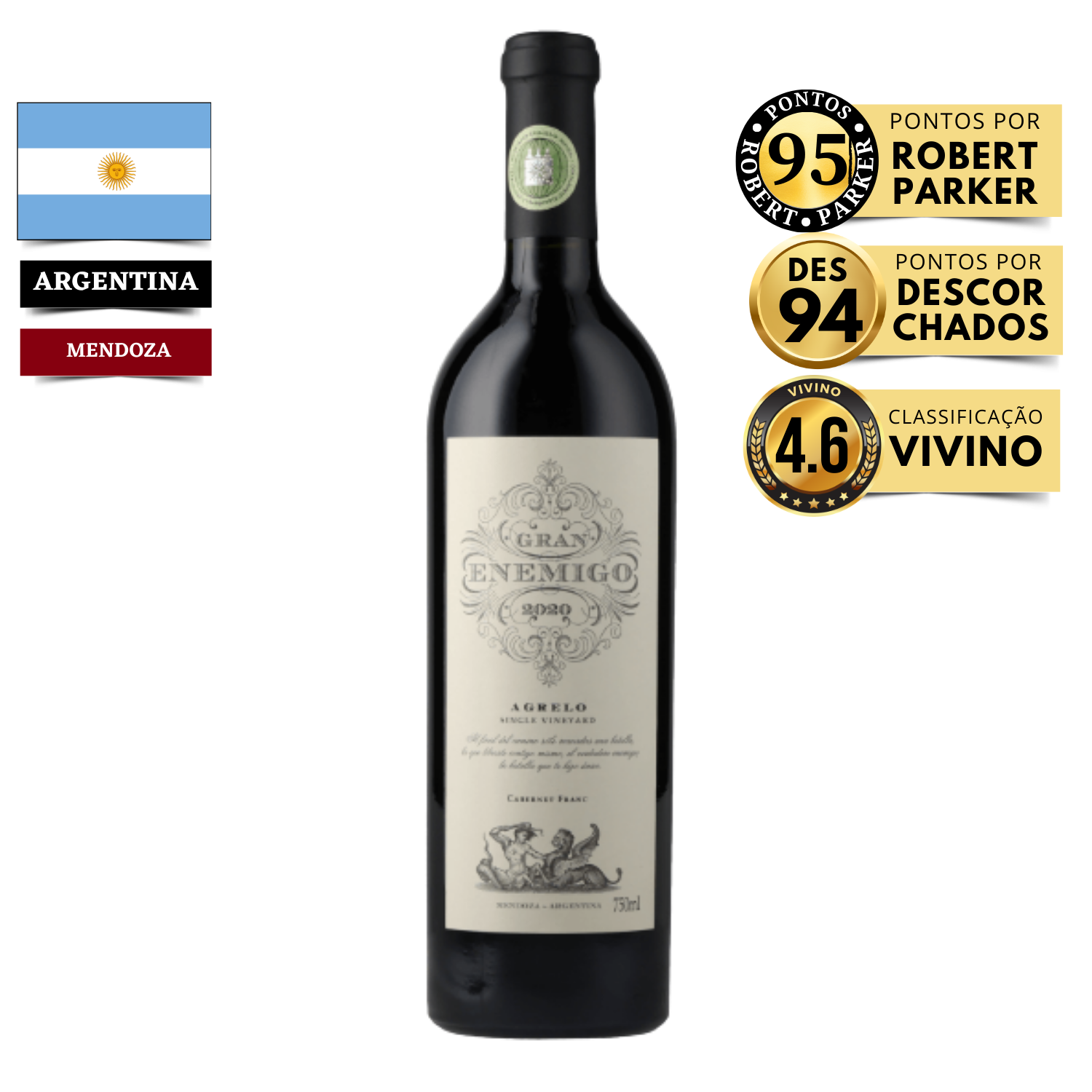 A Vinícola: El Enemigo é o projeto cult de Alejandro Vigil e Adrianna Catena. O Gran Enemigo é inspirado na tradição de Bordeaux, mas com a alma vibrante dos solos mendocinos. Diferencial: O terroir de Agrelo é conhecido como a "terra dos solos pesados", conferindo ao Cabernet Franc uma estrutura e uma maciez tânica incomparáveis, maturadas por 18 meses em foudres centenários.